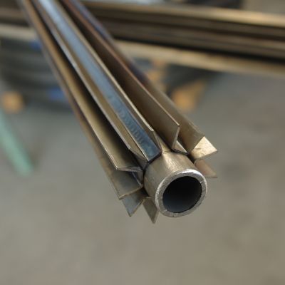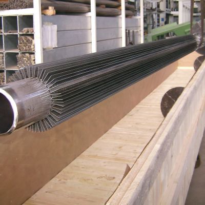 Il nostro tubo alettato è particolarmente efficiente in quanto le canaline sono saldate sul tubo per mezzo della tecnica di saldatura a resistenza. Ogni canalina è il risultato di un nastro piegato a forma di U (realizzato da noi) in modo che le due gambe di questa U siano le alette. Il numero delle alette sarà sempre un multiplo di quattro con un numero massimo di alette che dipende dal diametro esterno e dai calcoli termodinamici previsti per un dato specifico ordine.